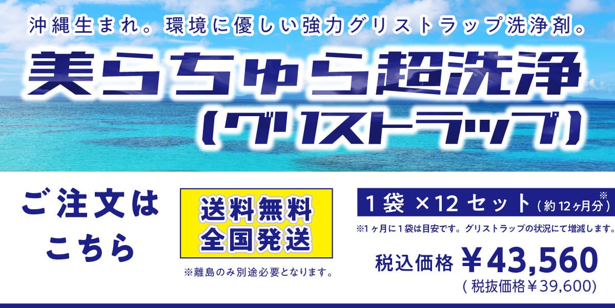 美らちゅら超洗浄(グリストラップ)を使いはじめてまずニオイが消えた事にびっくりしました。今まで毎日の油・ゴミ取りと週一回の掃除する時は油でドロドロになっていたのも無くなり、毎日のゴミ取りと20~30日に一度、美らちゅらを入れる作業だけになりました。かなりオススメの商品だと思います。
